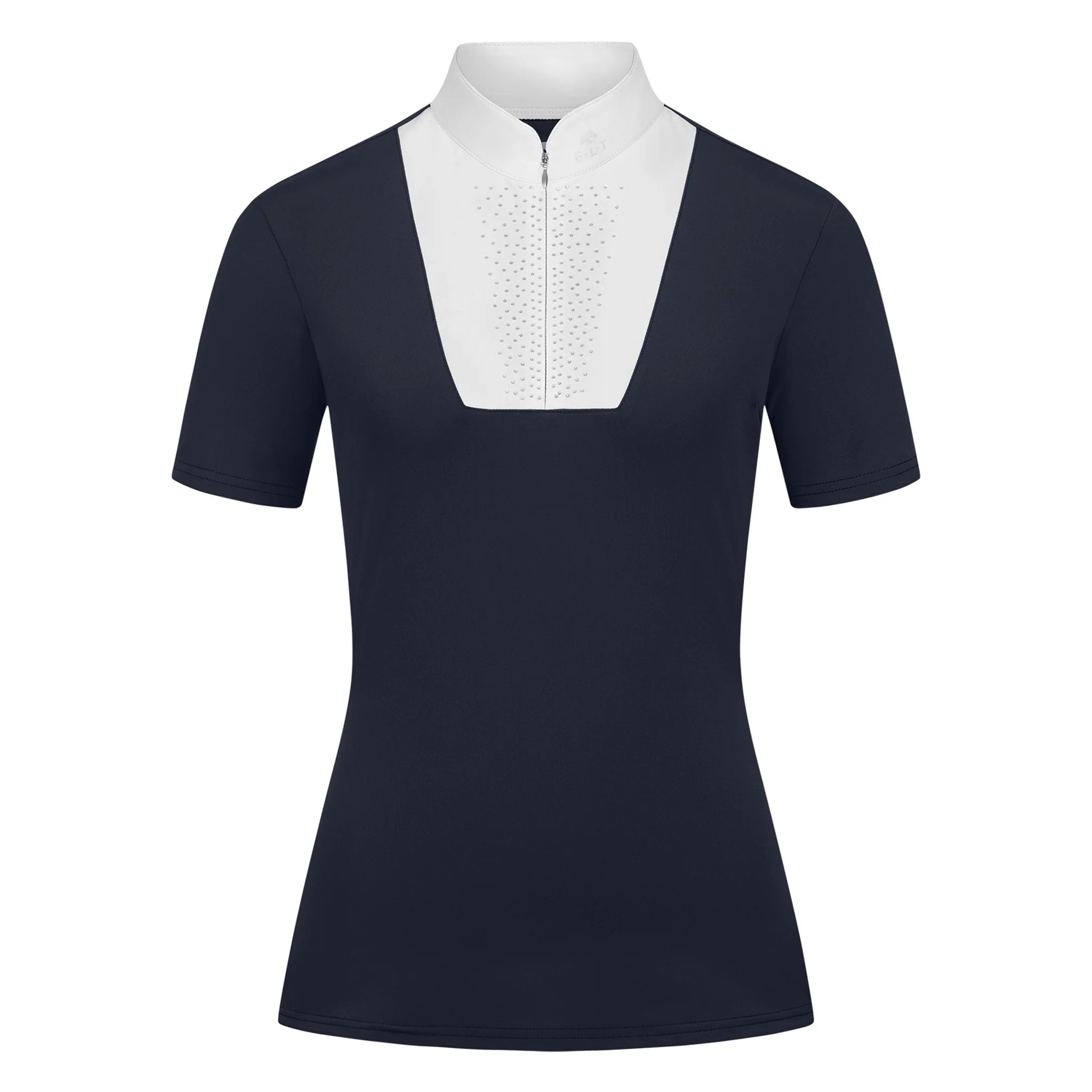 A stand-up collar with a seamless zip closure delivers a modern, polished look, complemented by a refined front insert delicately adorned with sparkling rhinestones. Subtle glittering E·L·T logo prints on the collar and back add the perfect finishing touch, making this shirt as stylish as it is functional.